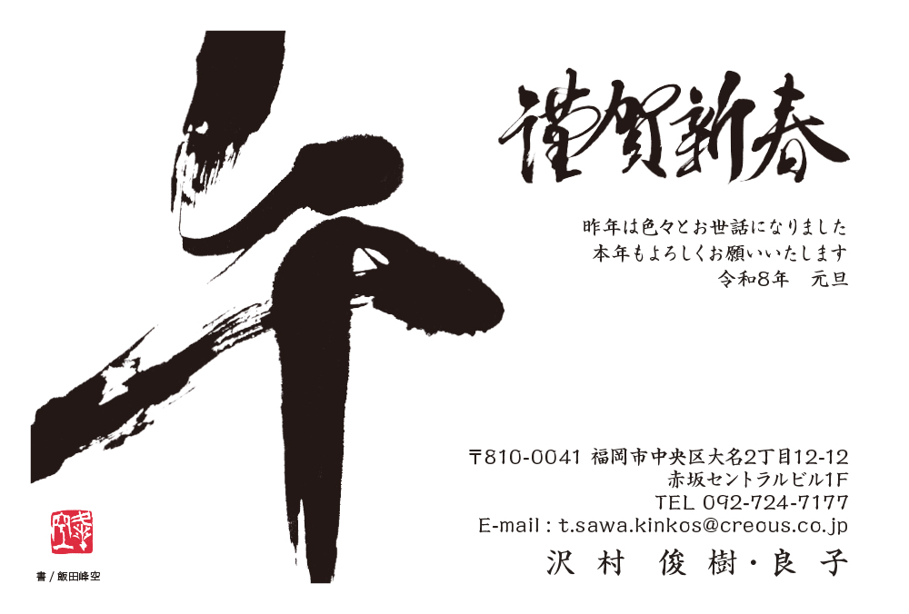 干支の「午」をテーマにした年賀状は、午の字を大きくデザインしています。横の線で馬が駆ける様子を、最後の縦の線で凛とした立ち姿をイメージしました。